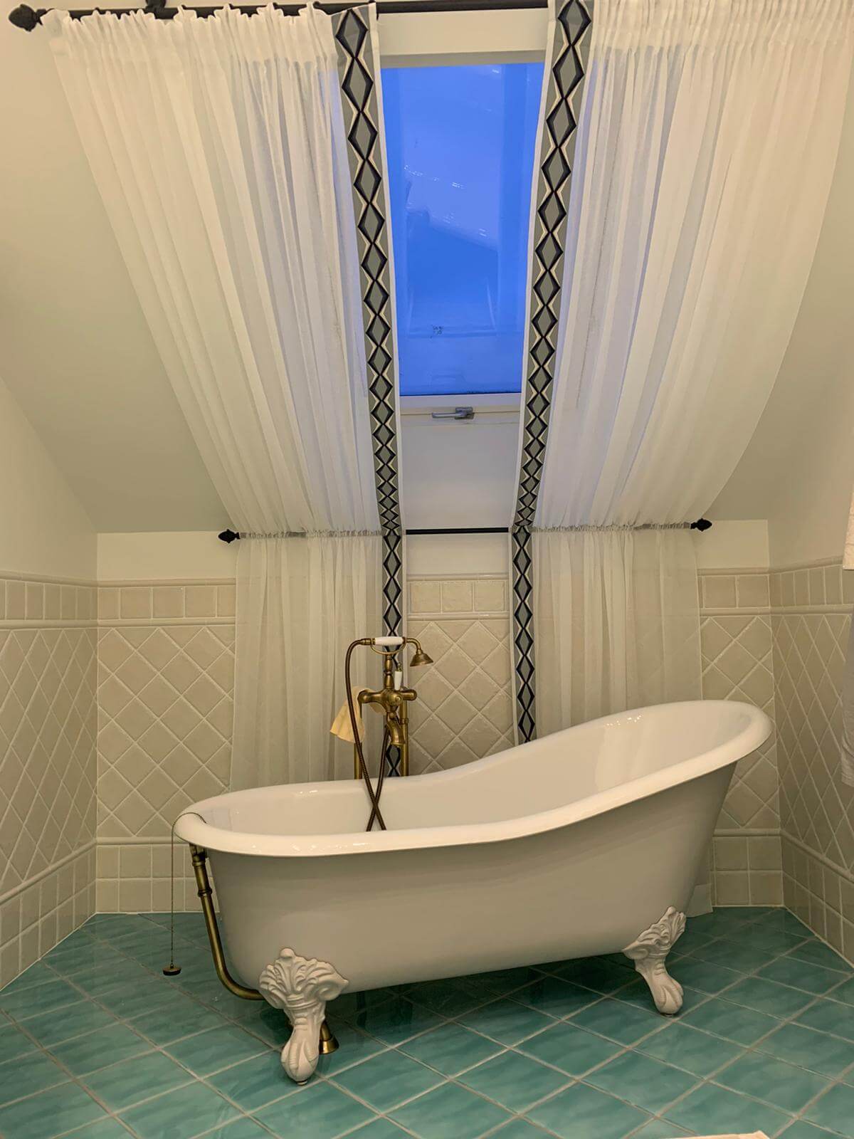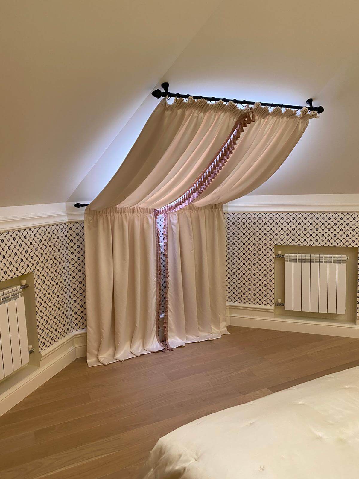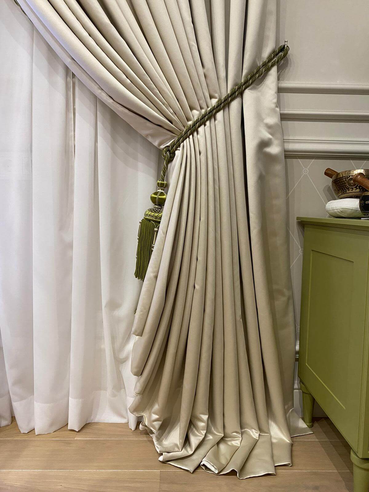 Dom w stylu nowoczesnej klasyki. Tekstylia do tego wnętrza była dobierana razem z projektantem. Najbardziej ciekawym elementem dekoracji tekstylnej tego wnętrza naszym zdaniem są rolety rzymskie z niebanalnym dołem i sznurem dekoracyjnym. Wszystkie zasłony są wykonane z satyny w kolorze ecru i udekorowane taśmą dekoracyjną.