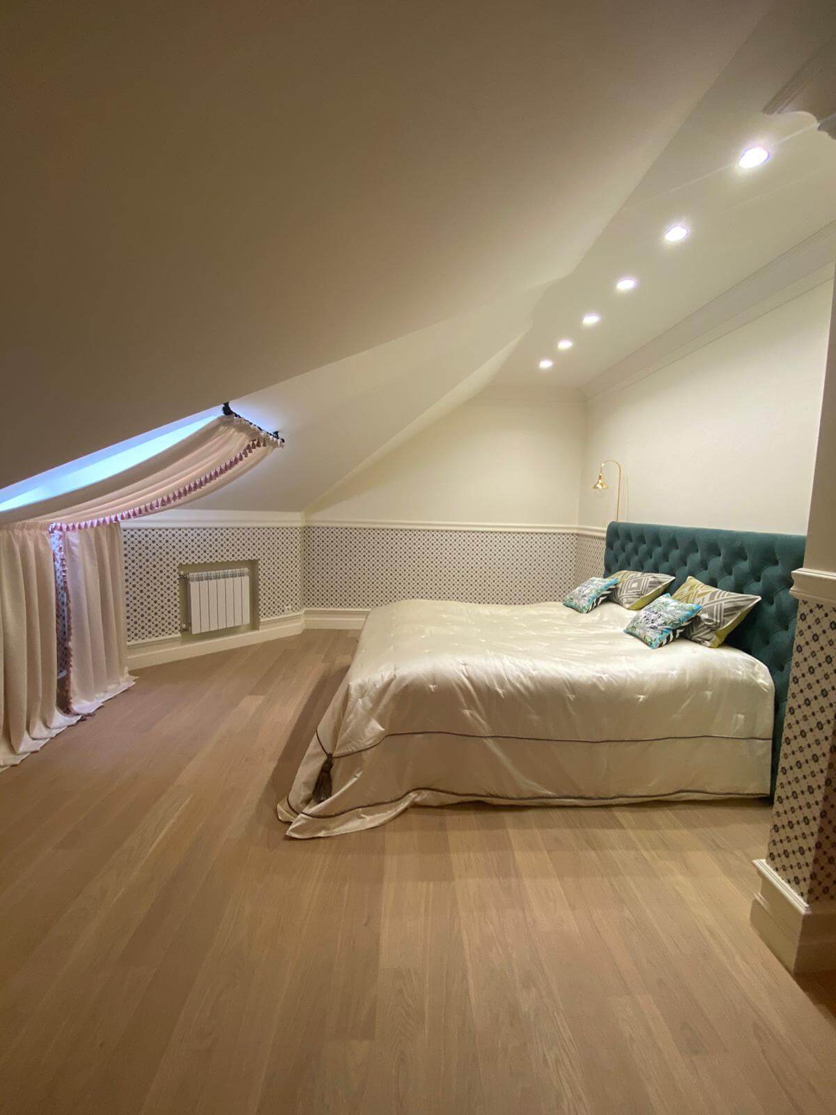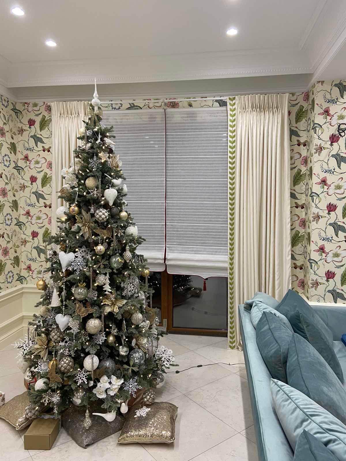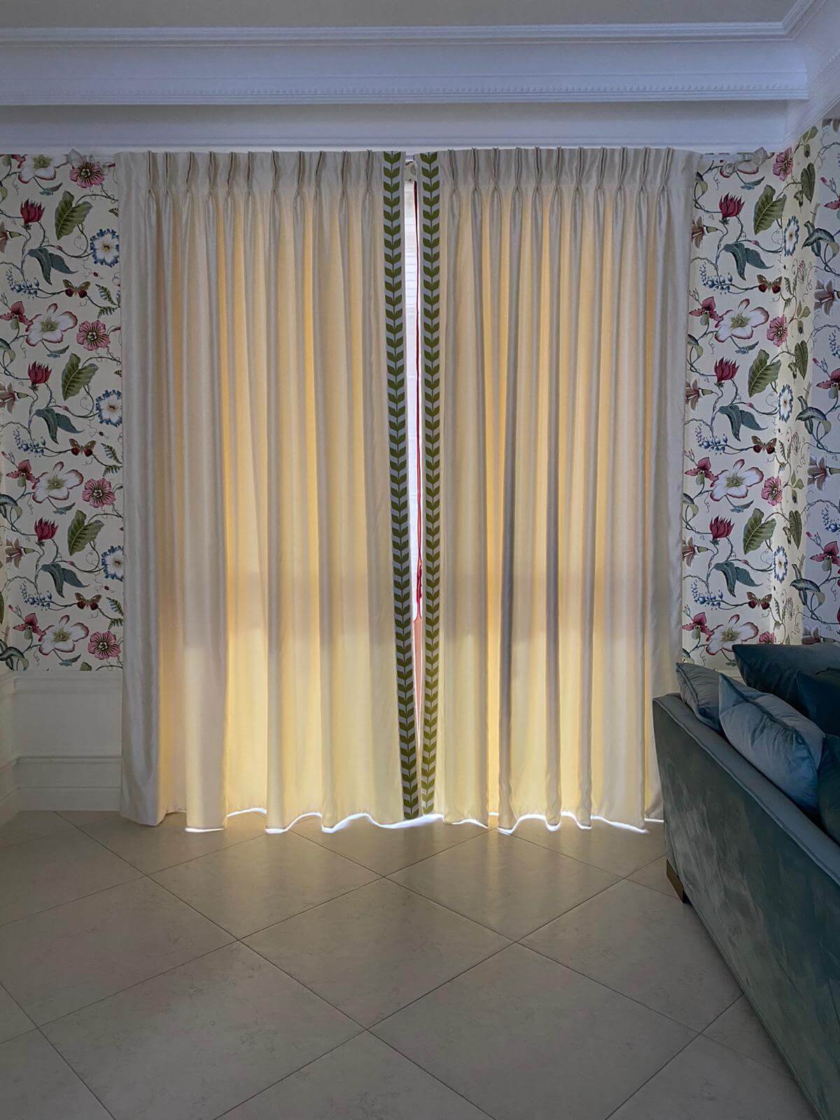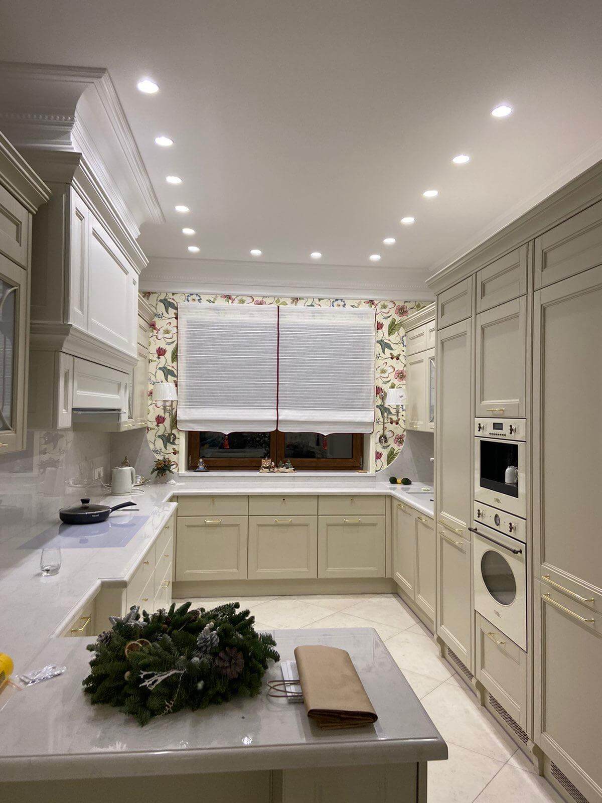 Dom w stylu nowoczesnej klasyki. Tekstylia do tego wnętrza była dobierana razem z projektantem. Najbardziej ciekawym elementem dekoracji tekstylnej tego wnętrza naszym zdaniem są rolety rzymskie z niebanalnym dołem i sznurem dekoracyjnym. Wszystkie zasłony są wykonane z satyny w kolorze ecru i udekorowane taśmą dekoracyjną.