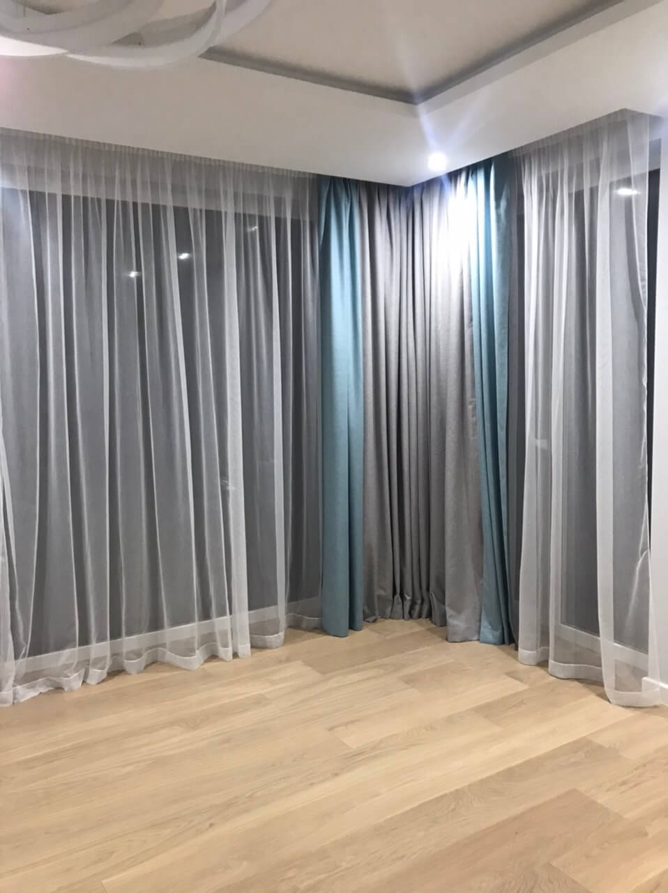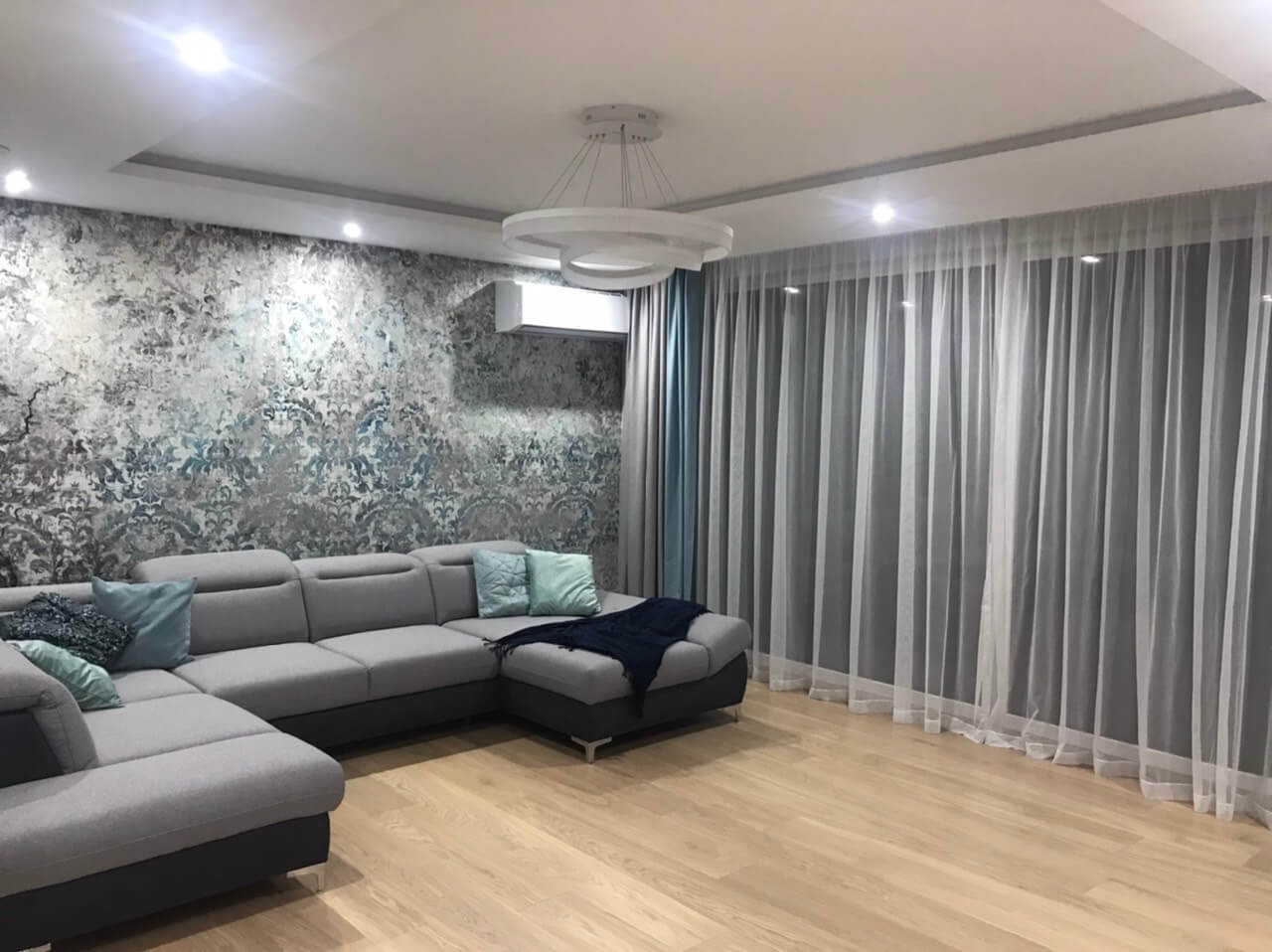 Dom pod Warszawą. Zasłony i firany do salonu i jadalni. Wykorzystaliśmy lekką białą tkanine firanową DEKOMA oraz tkanine zasłonową MARGO w dwóch kolorach. Zależało nam na tym, żeby dopasować kolor zasłon do kolory tapet na jednej ze ścian, więc dodaliśmy turkusową wypustkę.